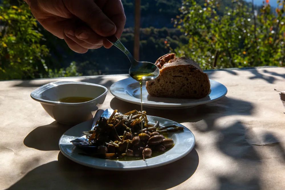 ↑在希臘伯羅奔尼撒半島麥西尼亞,一名男子往盤(pán)中加入橄欖油。
