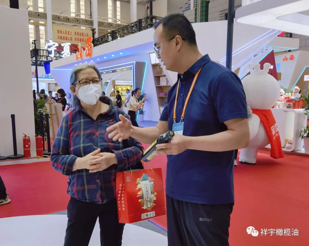 展會現(xiàn)場,來賓、客商紛紛到祥宇橄欖油展臺前駐足品鑒,