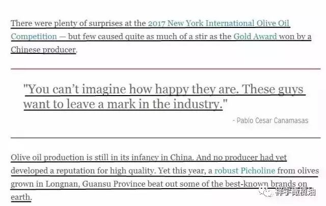譯文:在2017屆紐約國際橄欖油大賽上驚喜不斷,但卻未曾出現(xiàn)過中國原產(chǎn)的橄欖油獲得金獎(jiǎng)這樣的轟動(dòng)。