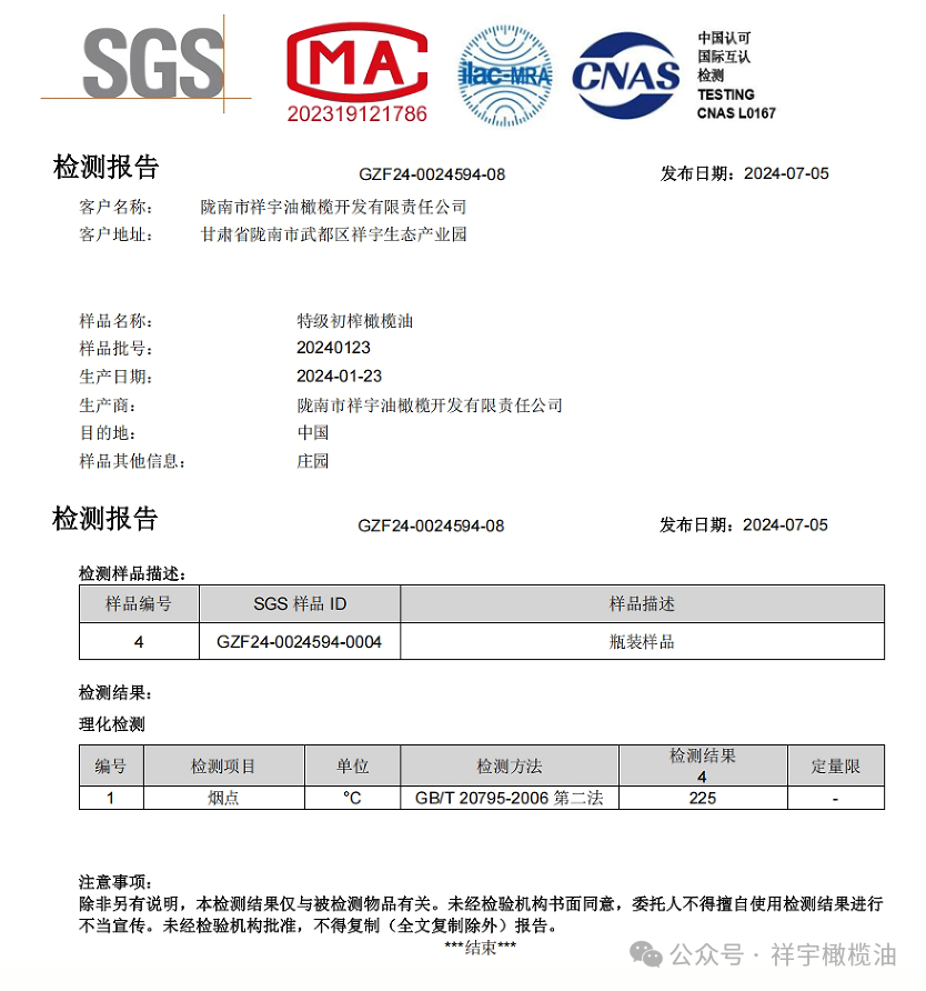 祥宇特級初榨橄欖油煙點(diǎn)報(bào)告